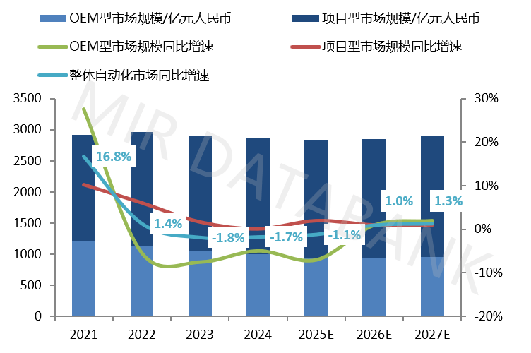 按照MIR DATABANK数据表白,2024年中国全体从动化市场规模近3000亿元,同比下降1。7%,且市场曾经持续两年呈现负增加态势。